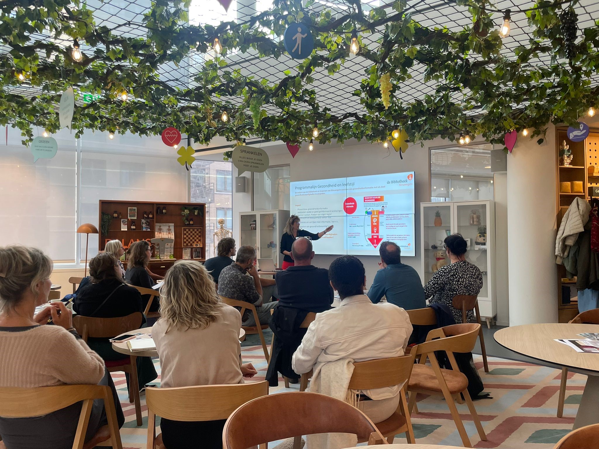 Colinda Olff is programmamaker Gezondheid en Leefstijl en onze gastvrouw van de dag. Ze vertelt dat de bibliotheek Nieuwegein zichzelf niet als zorgverlener ziet, maar als voorportaal en vooral als kennismakelaar: de plek waar mensen, kennis en initiatieven samenkomen. Samenwerking met bijvoorbeeld wijkinitiatieven, zorgorganisaties en studenten van de Hogeschool Utrecht speelt daarbij een belangrijke rol.
